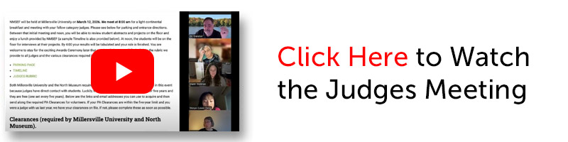 NMSEF will be held at Millersville University on March 12, 2026. We meet at 8:00 am for a light continental breakfast and meeting with your fellow category judges. Please see below for parking and entrance directions. Between that initial meeting and noon, you will be able to review student abstracts and projects on the floor and enjoy a lunch provided by NMSEF (a sample Timeline is also provided below). At noon, the students will be on the floor for interviews at their projects. By 4:00 your results will be tabulated and your role is finished. You are welcome to stay for the exciting Awards Ceremony later that evening. Below you will find a link to the rubric we provide to all judges and the various clearances required by Millersville University.